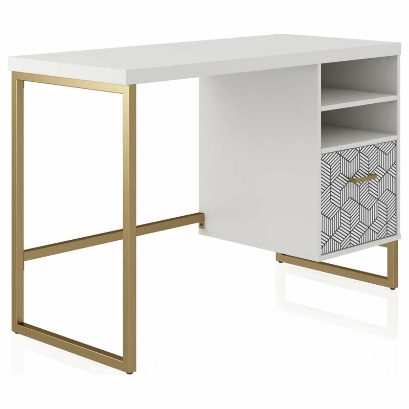 - The Scarlett is built on durable gold metal legs with a roomy patterned drawer to store your ~things~ and two open shelves to obsessorize.