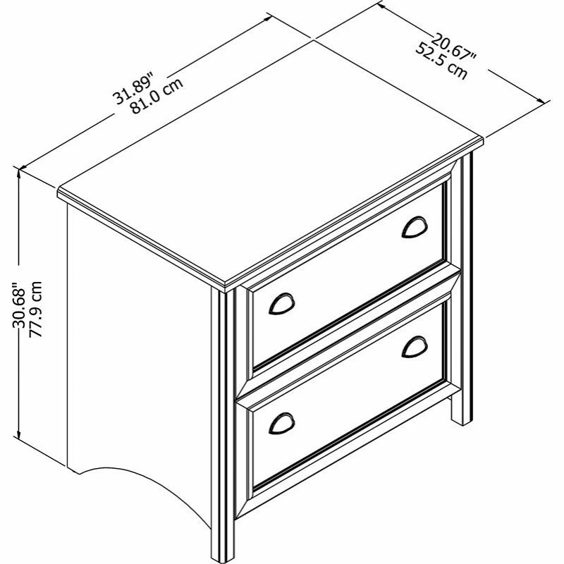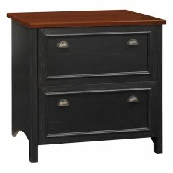Blend style and functionality in your home office with the Bush Furniture Fairview 2 Drawer Lateral File Cabinet in Antique Black. The charming Hansen Cherry top surface and beautiful Antique Pewter hardware accents blend perfectly with existing decor. Height matches the Fairview Computer Desk (sold separately) for an extended work surface when positioned side-by-side. Full-extension file drawers glide on smooth ball bearing slides for easy access to letter, legal or A4-size files. An interlocking drawer mechanism prevents tipping for added safety. Fairview meets ANSI/SOHO quality test standards for performance and safety and comes with a Bush Furniture 6 Year Manufacturer’s Warranty. With casual styling and traditional detail, Fairview offers an alluring appearance without sacrificing functionality. See the full collection for coordinating home and office items available.