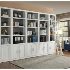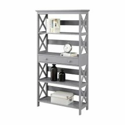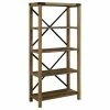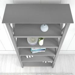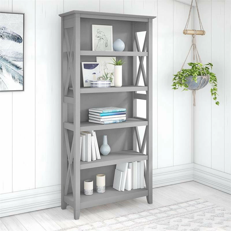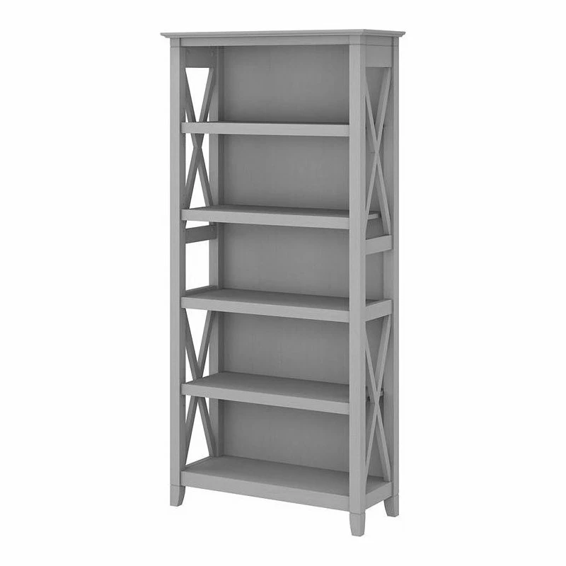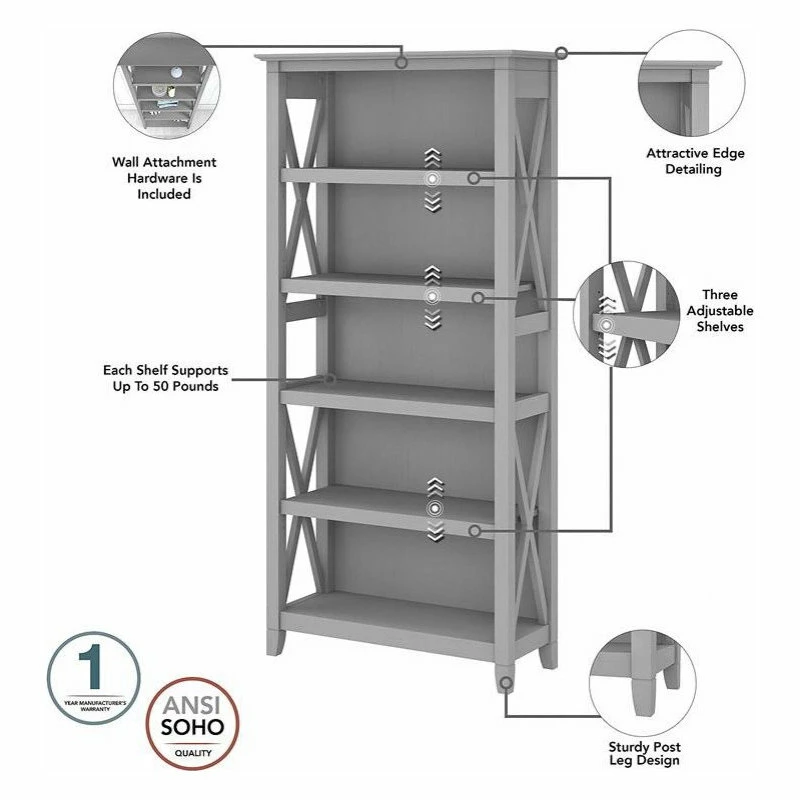 The Bush Furniture Key West Tall 5 Shelf Bookcase is a perfect way to show off your favorite artwork, photos, plants and more. Three adjustable shelves accommodate items of various sizes while two fixed shelves provide stability. Each shelf supports up to 50 pounds so you can store your personal library and display decorations with confidence. Stylish touches include unique X pattern accents on the side panels as well as a sturdy and attractive post leg design. This 5 tier bookshelf includes wall attachment hardware for family-friendly safety and security in any home office or living room. A perfect choice for homes that embrace cottage, coastal and farmhouse decor, the Key West Collection includes a variety of coordinating items to expand your space as needed. This tall Bookcase is tested to meet ANSI/SOHO quality standards for safety and performance and is backed by a 1 Year Warranty.