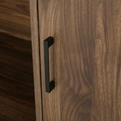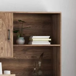 STORAGE SPACE: Our bookcase offers four shelves and two creatively placed cabinets to organize and display a variety of items in a convenient manner. The cabinet doors are finished with sleek black handles for convenient access.