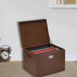 - OUR BEST SELLING COLORS — Our file box comes in two stylish colors that compliment any office or home decor. Our luxurious faux leather black is paired with white stitching and a black velvet interior that creates a classic professional edge in any room. Our mocha brown is joined by white stitching and a brown velvet interior to organize files in a polished way.