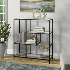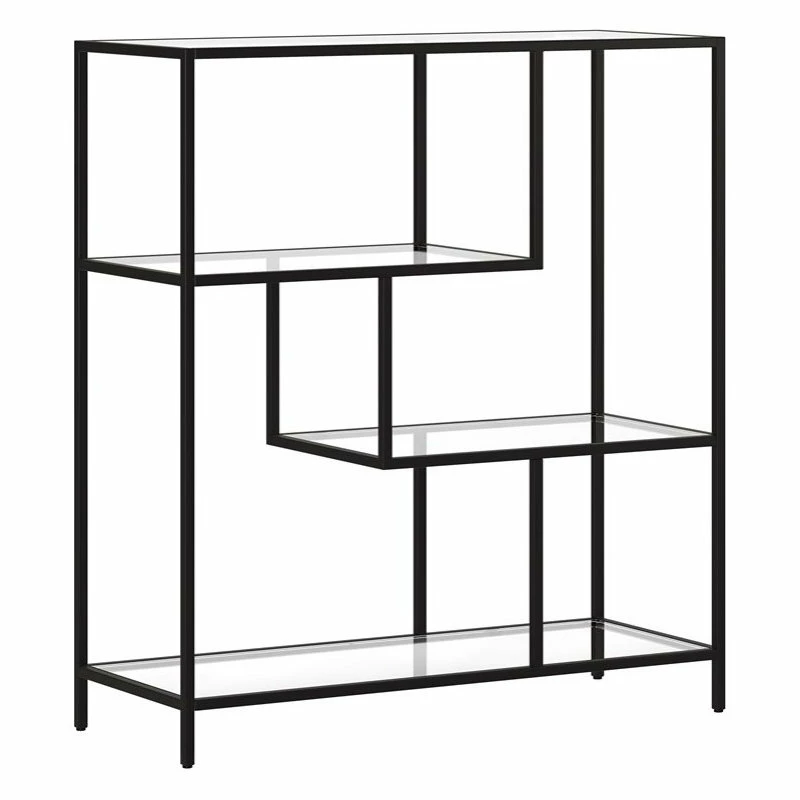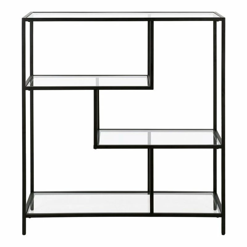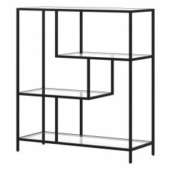 Combine functionality and on-trend design with this eye-catching and versatile bookcase. The clean lines of its steel frame instantly update any storage space, pairing perfectly with your modern home office or mid-century den. Its compact footprint makes this the perfect storage space if youβre working with a tight corner or smaller space. The geometric, staggered shelving is made of durable tempered glass, creating plenty of storage without weighing down the room visually. The four tiers allow you optimal space to display your books, pictures frames, plants and more!
