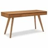 A study of the architectural elements comprising the structure of the Protractor Desk brings full appreciation for the modernist masterpiece. A chair would slide beneath two boomerang Solid Ash support beams. At the point where vertical transforms to horizontal, rounded oblong shapes have been cut out of the beams creating a transparent airy illusion. Resting on raised stainless steel support buttons, A 15mm thick tempered glass plate provides an elegant writing surface for Protractor. Stainless steel bolt sleeves float the wooden beams off the surface of the slatted cube of 5 drawers. On the opposite side, total transparency is achieved with an open faced single pull out drawer covered by a 15mm glass panel. Two steel rods extend from the boomerang beams, supporting the outer edge of the transparent drawer. A design marvel exceptionally reproduced and coated with a brilliant lustrous finish.
