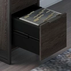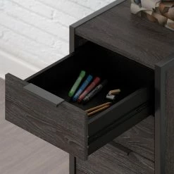Keep important paperwork and office supplies organized with a storage cabinet that blends elements of industrial and modern design. The Office by kathy ireland Atria 3 Drawer File Cabinet helps maintain an orderly workspace without sacrificing style. The full-extension file drawer accepts legal, letter and A4-size documents while two box drawers provide storage for small office supplies like writing utensils and notepads. All three drawers are built with smooth ball bearing slides for effortless opening and closing. The filing cabinet is finished on all sides for versatile placement and matches the height of Atria Desks (sold separately) to offer an extended work surface when positioned side-by-side. This file organizer is tested to meet ANSI/BIFMA standards for safety and performance and is backed by a 6 Year Manufacturer’s Warranty. American made with U.S. and imported parts.