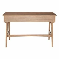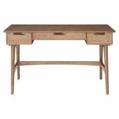 Escape the stuffiness of corporate office decor and bring new life into your home workspace with this mid century inspired rattan desk. The top, side and back panels glow in a natural birch veneer and are complimented by 3 handwoven rattan drawer fronts with cutout handles. The base is made of solid wood and outfitted with glides on its feet to protect hardwood floors. Thereβs no need for productivity and style to be mutually exclusive in your study, bedroom or living room with this timeless piece.