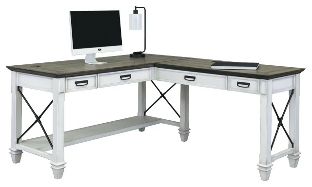 The bold lines and distressed finish of the Hartford L-Shaped Desk give your workspace a sense of sophisticated character. The 2 utility drawers and 2 center drawers with drop down fronts allow you to neatly tuck away important materials, while the power center will keep all your electronics charged. Station this desk in the corner of your home office for an area thatβs big on both function and classic charm.
