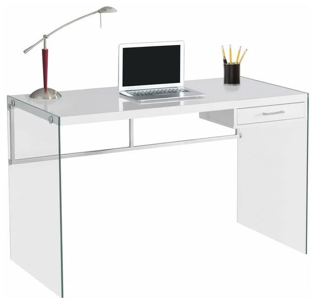 This sleek and contemporary glossy white work desk is the perfect combination of function, durability and design in a modern form. With clean lines, thick panel construction and 8mm thick tempered glass legs, this desk will add pizzazz to any home office. The desk top provides the ideal surface space for a lamp, picture frames, laptop or tablets to meet your working needs along with a convenient storage drawer for your office supplies.