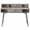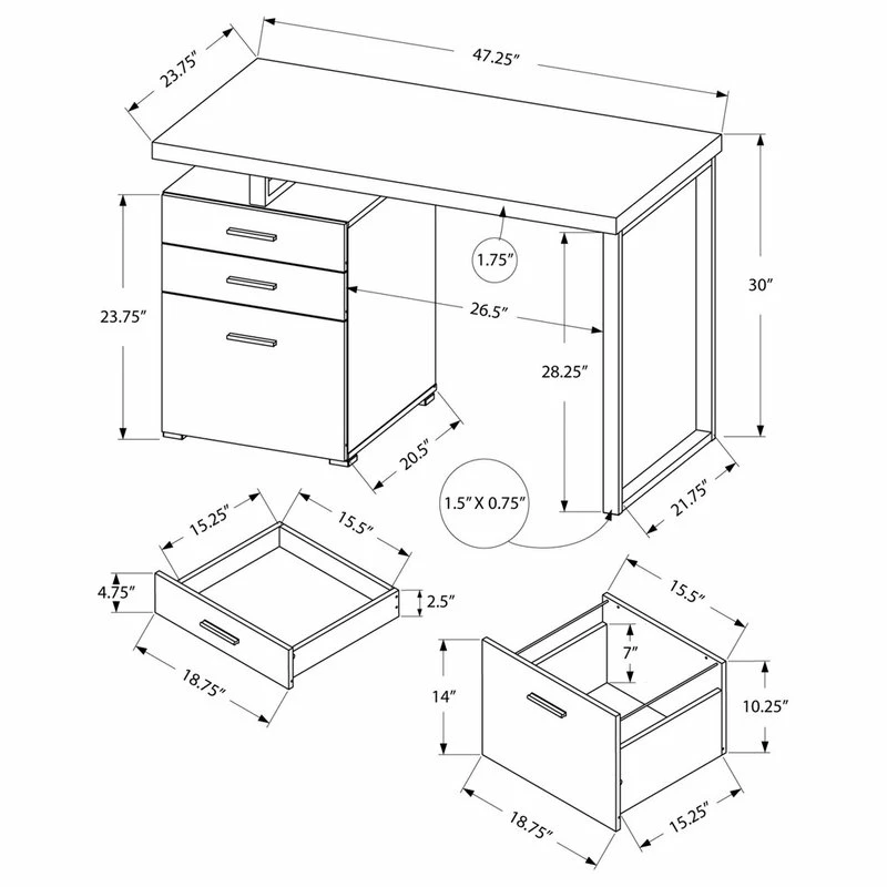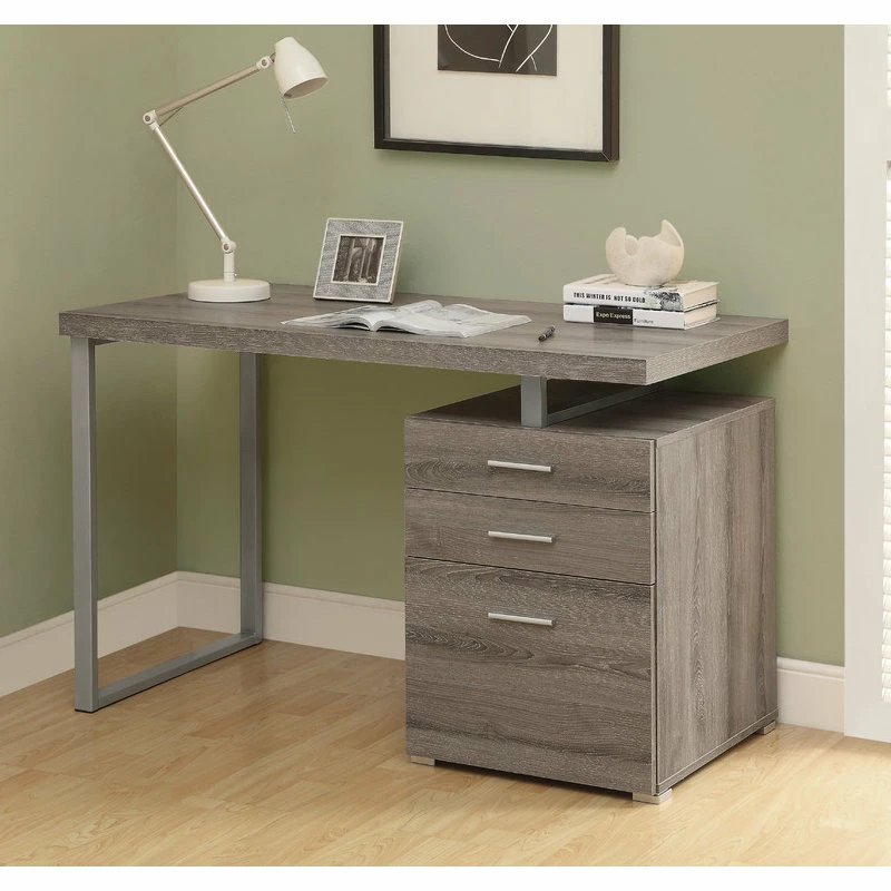 Sleek and contemporary, this dark taupe reclaimed look finished desk is the perfect combination of function, durability and design in a modern form. With clean lines, a floating top work station and sleek track metal legs, this piece will add pizzazz to any home office. Featuring two storage drawers and a file drawer that can conveniently be assembled on the left or right side, making this unit uniquely yours to design. The large thick paneled surface provides plenty of room to meet your working needs without compromising style.