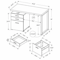 - Sleek track metal leg (26.5″W between the leg and side drawers)