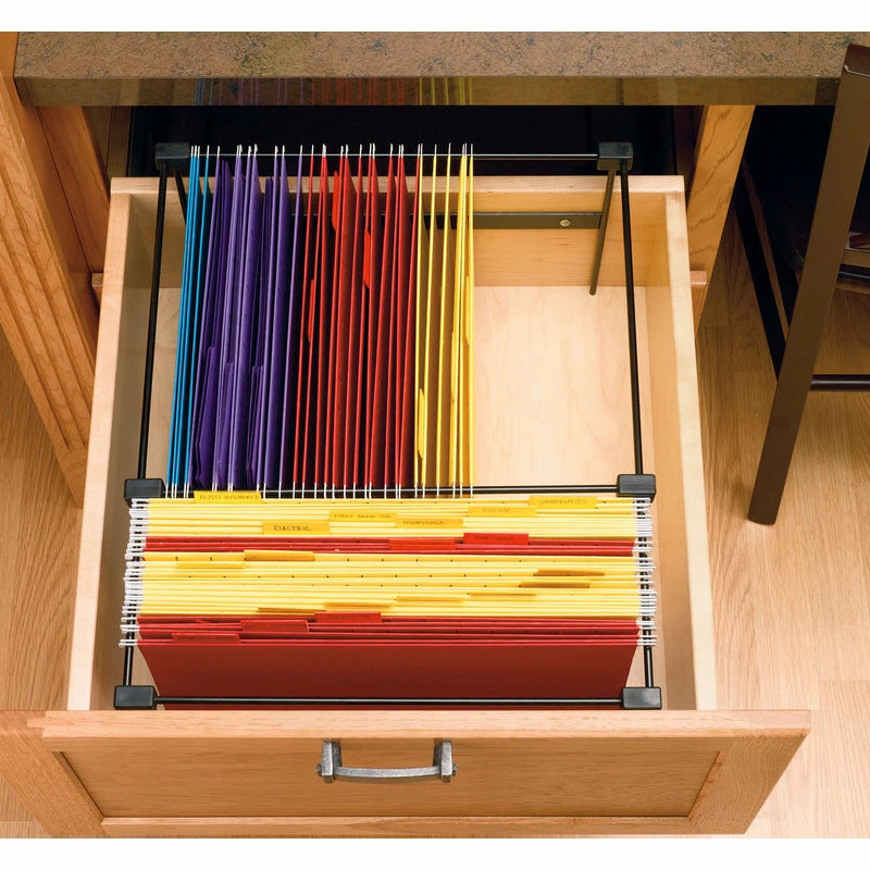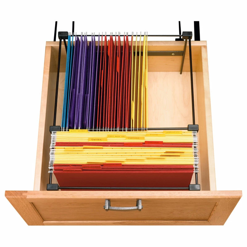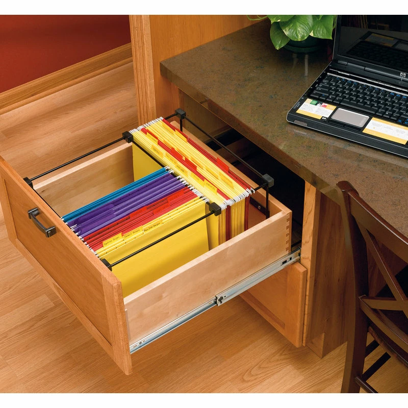 Organize recipes, coupons, bills and more with Rev-A-Shelf’s File Drawer System available in both legal and letter size dimensions. The RAS-FD organizer features front and back frames that fasten to the drawer box for complete stability and a versatile T-Rod that creates divided storage for both legal and letter size folders. This durable file drawer system is designed for base 18 and base 21 cabinets but features metal supports that can be trimmed to fit virtually any cabinet drawer.-13″W x 19-1/4″D x 9-3/4″H- Black- Can be trimmed to fit- Designed for base 18 cabinets- Designed for letter size hanging folders- Limited lifetime warranty- Small File Drawer System
