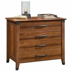File in style with this lateral file cabinet from the Carson Forgeยฎ collection. This two drawer lateral file features drawers with full extension slides that hold letter or legal size hanging files to keep your most important documents secure and organized. A patented, interlocking safety mechanism allows only one drawer to open at a time to keep your wood lateral file cabinet stable and safe. We know you want to get to organizing as quick as possible, thatโs why this lateral file cabinet includes quick and easy assembly with a patented T-lock drawer system. Finished in Washington Cherry and paired with wrought iron style hardware and accents, this rustic file cabinet will add some sweet style to your home dรฉcor and get your organized too! We hope you like what you see. Sauder designers travel the world and bring back the best and latest in style, finish, and color trends. This inspiring world travel is evident in the cutting edge and innovative furniture solutions we offer to you!