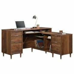 Enhance your home office or workspace with this l-shaped desk from the Clifford Place collection. Never run out of workspace โ this mid-century inspired desk provides you with an abundance of tabletop space for all your office essentials like your laptop, important papers, notepads and much more! It features a slide out keyboard/mouse shelf that opens and closes on smooth metal runners. Storage is no issue with this desk! It includes three easy gliding storage drawers and two file drawers with full extension slides that accommodate letter-size hanging files. It also features cubbyhole storage for easy access storage of books, bins and folders. Its grommet holes and pass-throughs allow you to keep all your cords and wires neat and out of the way. The return can be fastened on to the left or right side to fit the needs of any room in your home. Finished on all sides in a warm Grand Walnut and accented with solid wood feet and bold brass hardware, this handsome desk will take your office space to a whole new level.