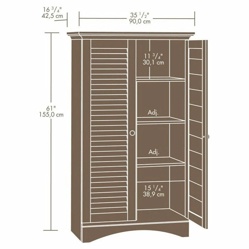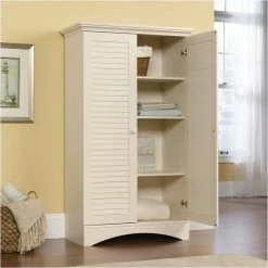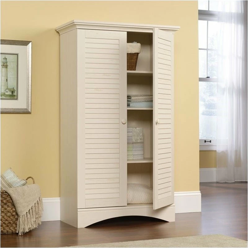 With this storage cabinet from the Harbor Viewยฎ collection, you can add extra storage space to any room in your home. Itโs perfect for bedroom furniture, living room storage furniture, the utility room, or just about anywhere. Behind the two louver detailed doors is hidden storage for all of the mess and clutter you can think of. Four adjustable shelves allow for customizable storage options for a variety of items like blankets, books, board games, and more. This home storage cabinet features a full upper shelf so you can store clothes, towels, or holiday decorations. Finished in a beautiful Antiqued Whiteยฎ and detailed with solid wood knobs, this stylish 2-door storage cabinet will keep you organized with ease. We hope you like what you see. Sauder designers travel the world and bring back the best and latest in style, finish, and color trends. This inspiring world travel is evident in the cutting edge and innovative furniture solutions we offer to you!
