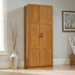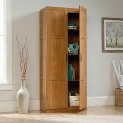 Looking to add some storage to your life? Check out this cabinet from the Sauder Select collection. This double door storage cabinet offers the perfect amount of style and practicality for any room in your home. This durable storage cabinet has four adjustable shelves and a full-width upper shelf so you can stash books, totes, blankets, pantry items and more. Finished in a beautiful Highland Oak and detailed with frame and panel doors and sides, this tall cabinet is ideal for the kitchen, basement, garage, utility room, or anywhere you need a storage solution. Store in style with this storage cabinet with doors from the Sauder Select collection. We hope you like what you see. Sauder designers travel the world and bring back the best and latest in style, finish, and color trends. This inspiring world travel is evident in the cutting edge and innovative furniture solutions we offer to you!