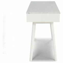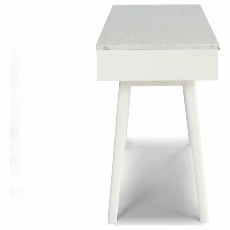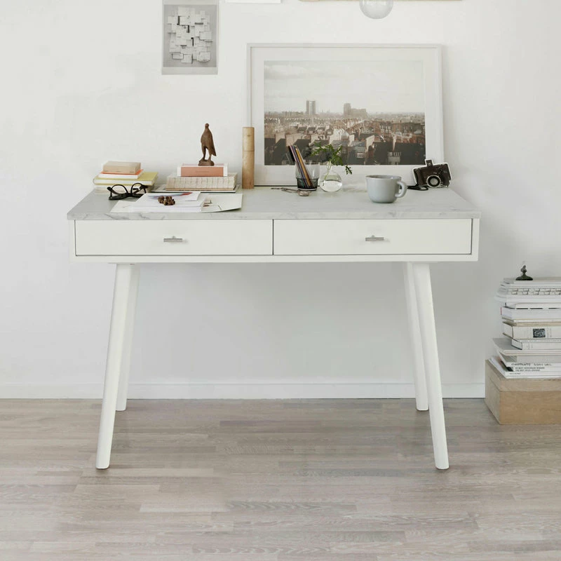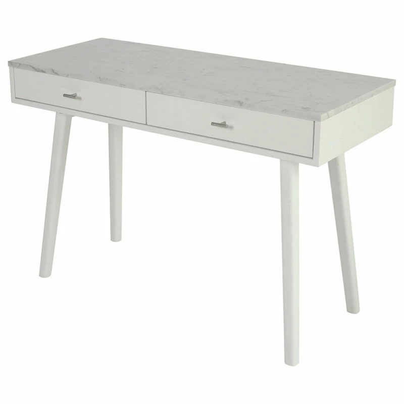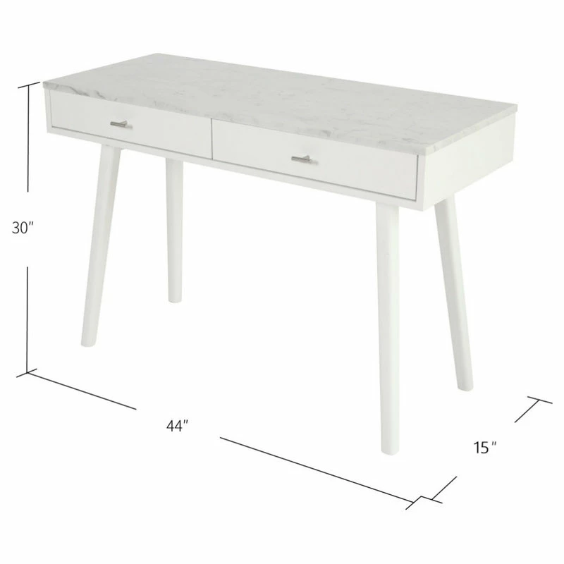 Versatile for many functions, this writing desk can be used as a laptop workspace, large console table, or vanity. Its compact shape easily accents a living room, bedroom, study, entryway, home office, or kitchen. Two wide drawers provide storage to help hide away your accessories and clutter. The desk base and legs come in four different neutral wood finishes paired with a classy white and grey marble to elevate and add style to any space.