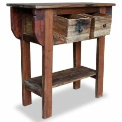 This wooden console table will be a perfect choice if you are looking to add a touch of rustic charm to your home decor. It has 2 drawers and 1 shelf, providing ample storage space for keeping all kinds of smaller items organized and within reach. This console table is made of solid reclaimed wood, which has the characteristics of different woods like mahogany, teak, mango wood, acacia, etc. Every piece of the furniture is unique and slightly different from the next. Signs of wear give each piece a unique look and add to its spectacular vintage style. As it is made of reclaimed wood, the product may show imperfections which reflect its authentic value and rich history. The wood comes from naturally fallen trees, boats, wooden houses, etc. Important note: The color may vary from piece to piece, making each of our console tables unique; the delivery is random.