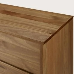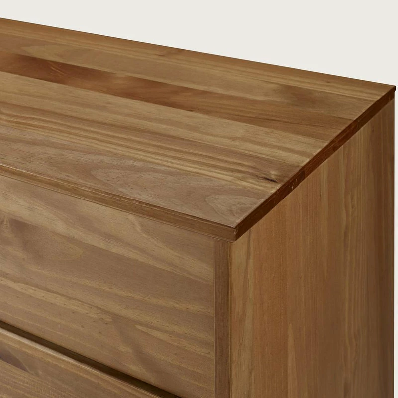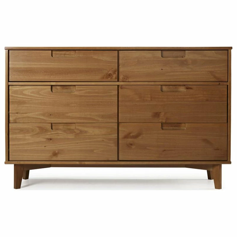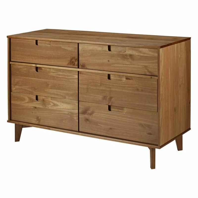 Add storage space into your home for your clothing and extra throws or pillows with this 6 drawer dresser. In a stylish, mid century modern design featuring angled legs and cutout handles of solid pine wood in a stained finish. The intriguing design integrates a transitional aesthetic to complement your home dοΏ½cor. With six storage deep drawers to keep your clothing organized in your bedroom or for blankets and extra bedding in your guest room.