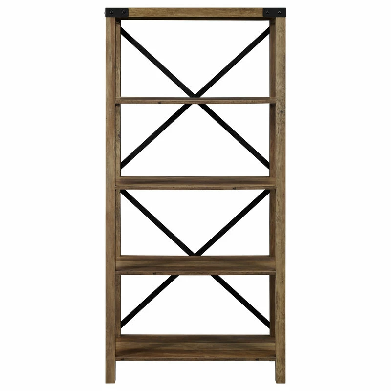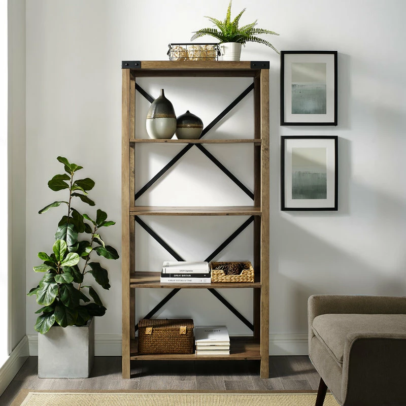 Provide shelving for your collectibles, books, and decor with this 64-inch bookcase with four spacious shelves. In a high-grade MDF, durable laminate, and metal design featuring metal accents on the corners and x-shaped backings. With a farmhouse style for a rustic, industrial appearance to your home. Add in your entryway, hallway, bedroom, kitchen, or home office to store your items and keep them organized.