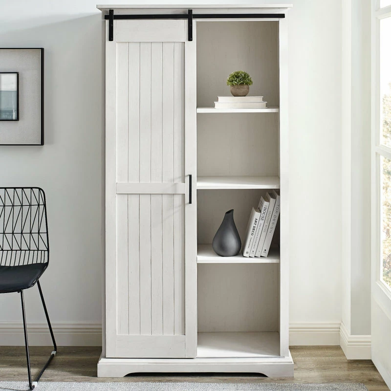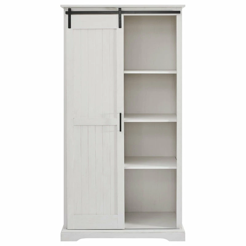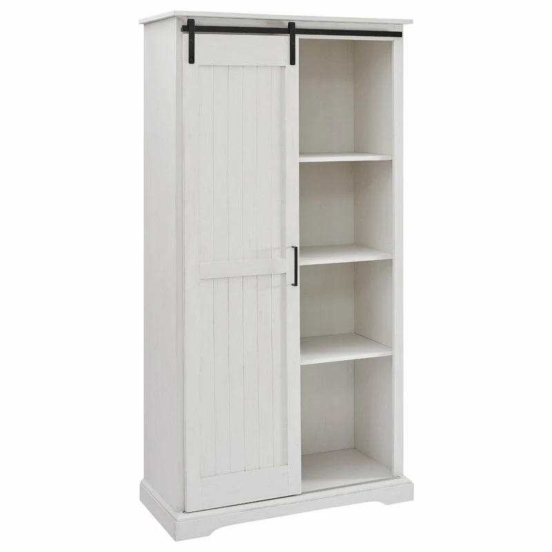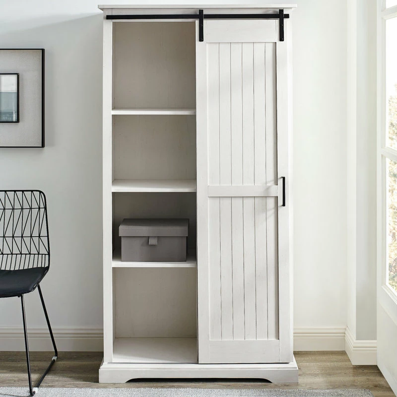 Get your hallway together with this vertical farmhouse storage cabinet. The grooved door front and rustic hardware offer a country-inspired look your whole family can enjoy. Place backpacks, hats, coats, or lunchboxes on the two fixed shelves and four adjustable shelves for an organized feel in your entryway or mudroom. The sliding door offers customizable organization as it moves smoothly on the metal track. Choose from three beautiful finishes to match your rural taste.