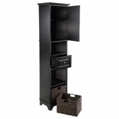 Ideal for anywhere in your home, the Winsome Wood Wyatt Cabinet is stylish and functional. Its elegant, rich black finish will add a touch of sophistication to any interior. It provides plenty of storage space for books, art, photos and more. The top of this black wooden cabinet features a wooden door with an adjustable shelf within. The middle section has open storage compartment and a drawer. The bottom includes a two-section storage area. Included with this unit are two foldable chocolate tone baskets that are a perfect fit for the bottom storage or to use anywhere else that may be convenient. So whether itοΏ½s in your living room, office or walk-in closet, this cabinet is constructed out of medium-density fiberboard (MDF) and is sure to deliver durable performance for years. The Winsome Wyatt Cabinet is ready for assembly, while the baskets only need to be prompt up and will be ready to use. Conveniently ships in 1 box. Replacement parts can be requested directly to the manufacturer within 60 days from date of purchase