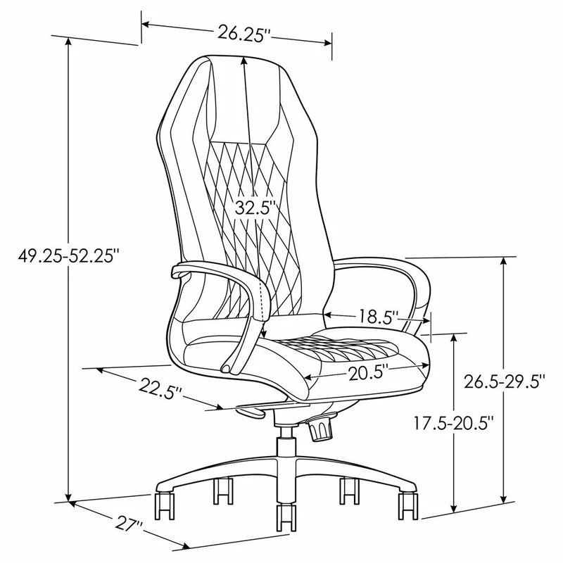 The Sterling Leather Executive Chair has that sculpted look that gives off a modern, opulent vibe. Protect your back from aching while working long hours with the curved lumbar and head support with padding. The seat, back, and gently curving armrests feature a seamed lattice pattern on luxurious genuine leather upholstery, while the back of the chair is finished in a high-quality leatherette match. The base consists of a polished aluminum five-pointed frame with smooth-rolling caster wheels for easy mobility around the office. The seat is adjustable in a variety of ways including a standard gas lift height adjustment lever. The reclining function transitions from fully upright at 90 degrees and tilting all the way back to 120 degrees. You can also lock the reclining position so that it will only go back to a certain point and you donβt have to worry about reclining farther back than is desired. There is also a tension knob that adjusts the resistance when reclining that you can make looser or tighter depending on how easily you want to be able to engage the tilting. The synchro mechanism reclines both the seat and backrest but at a 1:2 ratio that minimizes the recline of the seat in comparison to the backrest. This prevents the rocking chair effect and helps keep your feet on the ground while still increasing blood circulation and better spinal alignment. Be a little extravagant when you treat yourself and your office to the contemporary beauty and comfort which is the Sterling Leather Executive Chair. Suggested weight capacity 418 pounds.